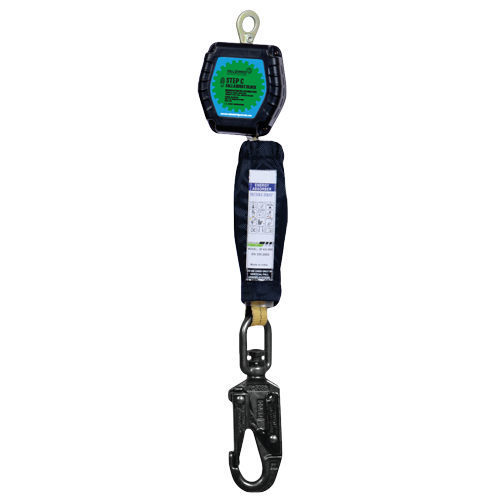 Lightweight, rugged auto retracting 2m kevlar webbing block with shock absorber, double action swivel snap hook with fall indicator to EN360:2002 for vertical and horizontal use.