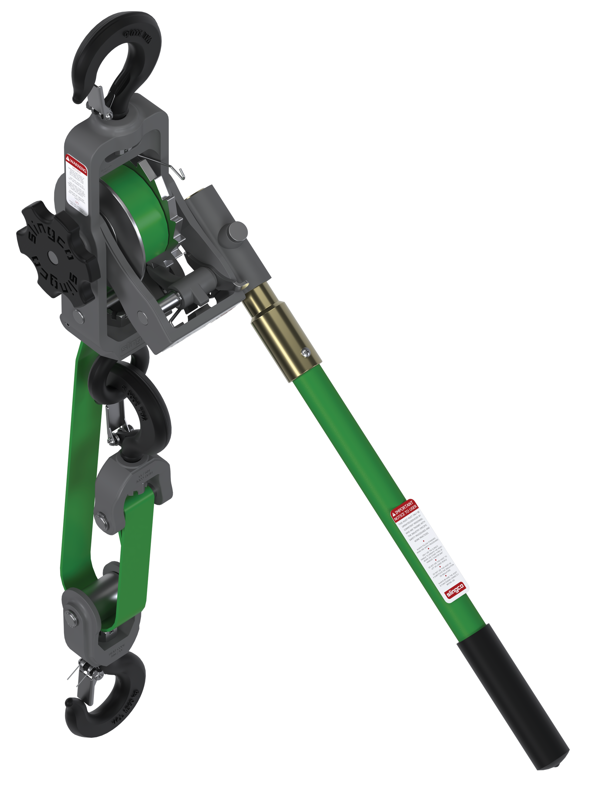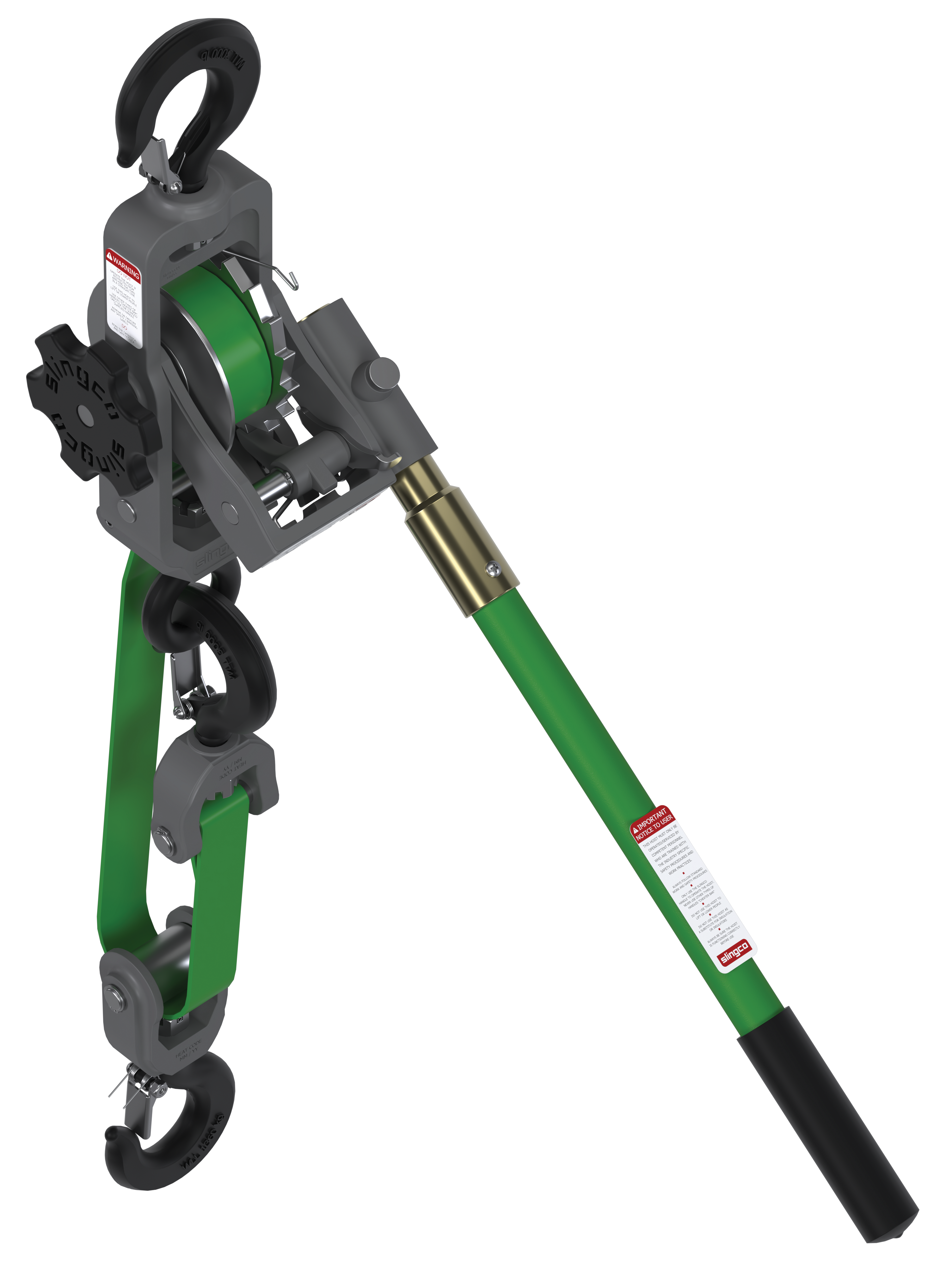 Use the Slingco 3k Strap Hoist to splice, dead end, and sag lines. The Slingco 3k Strap Hoist features an interlocking pawl lever system with dual pawl springs for controlled tightening and releasing of the strap and to ensure the hoist is engaged while in use. The strap hoist complies with ASME B-30-21 standard and all units are tested to 125% of load.
