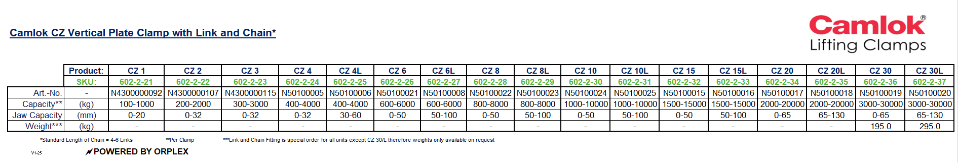 Camlok CZ Heavy Duty Plate Clamp with Link fitting & Chain* and Safety Lock