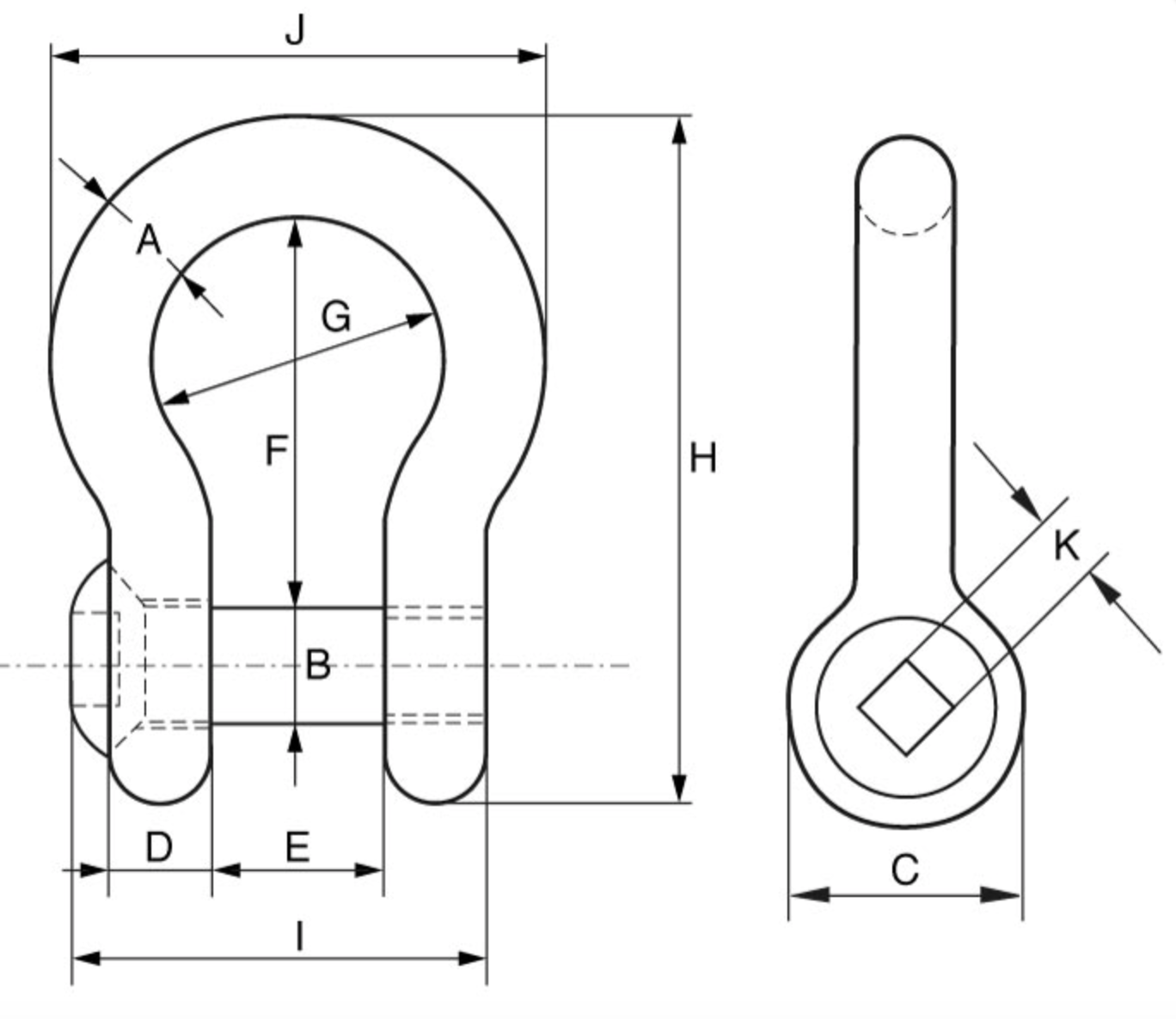 Green Pin Grade 6 Square Sunken Hole Bow Shackle