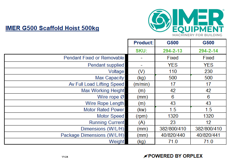 IMER G500 Scaffold Hoist 500kg - 110v - 42m High Capacity
