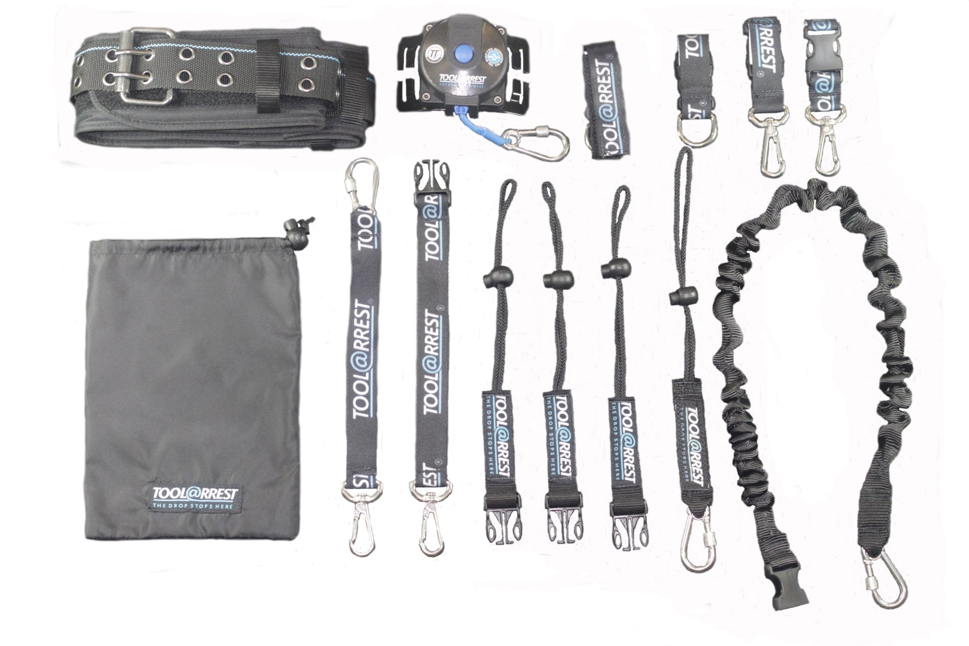 Polyester, padded, adjustable tool belt with auto retracting lanyard, wrist wrap lanyards, elasticated polyester webbing lanyards and tails with draw cord bag.