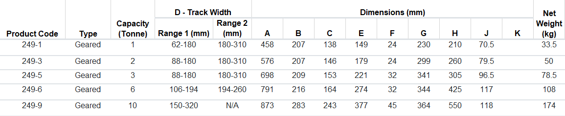 - D is the standard track width range. Please contact us for track widths outside of this range.