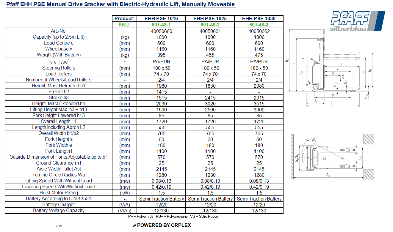 Pfaff EHH PSE Manual Stacker – 1000kg, 2500mm Electric Lift