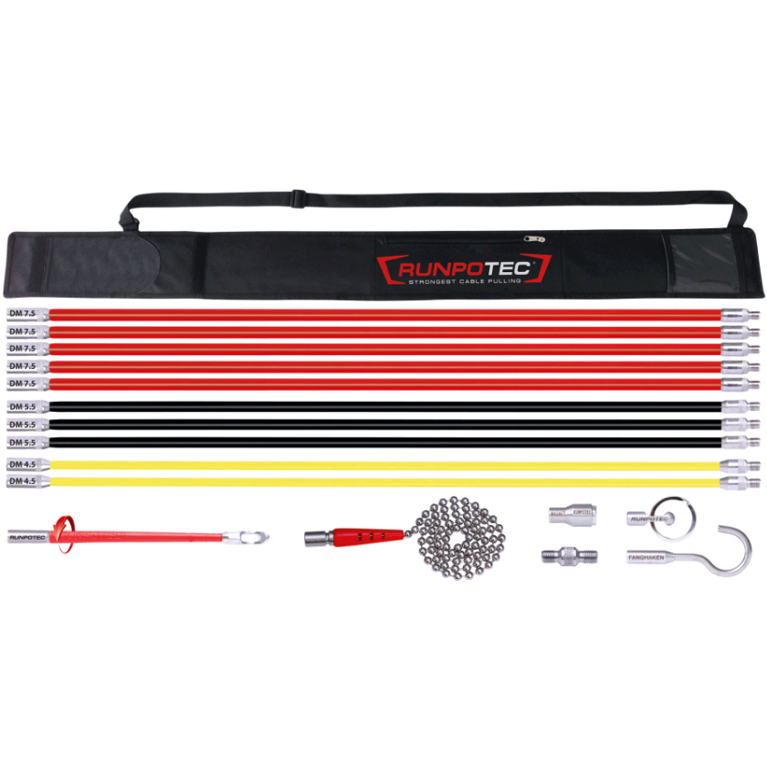 The new basalt technology allows extreme bending radii, however, the rods retain high dimensional stability. All connections have a RUNPOTEC RTG Ø 6 mm thread, have no butt edges or thread transitions. Objects weighing up to 2.5 kg can be held with the magnet. In combination with the magnet, the ball chain enables targeted locating or guiding to wall openings. All accessories can be perfectly stored in the practical storage bag with carrying strap.