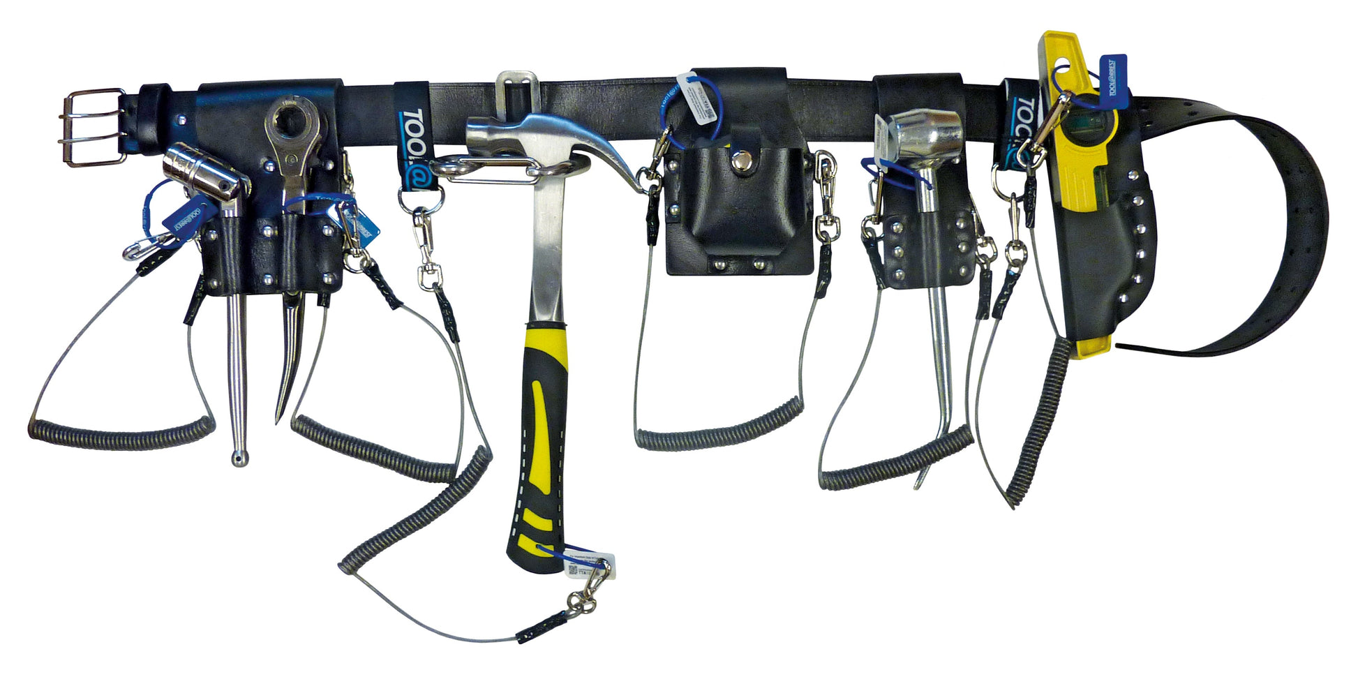 Black leather scaffolders belt with 5m tape measure, 250mm torpedo level, 7/16 scaffold spanner, 19 x 21mm podger spanner and podger hammer and 16oz claw hammer with black leather tool holders and coil lanyards.